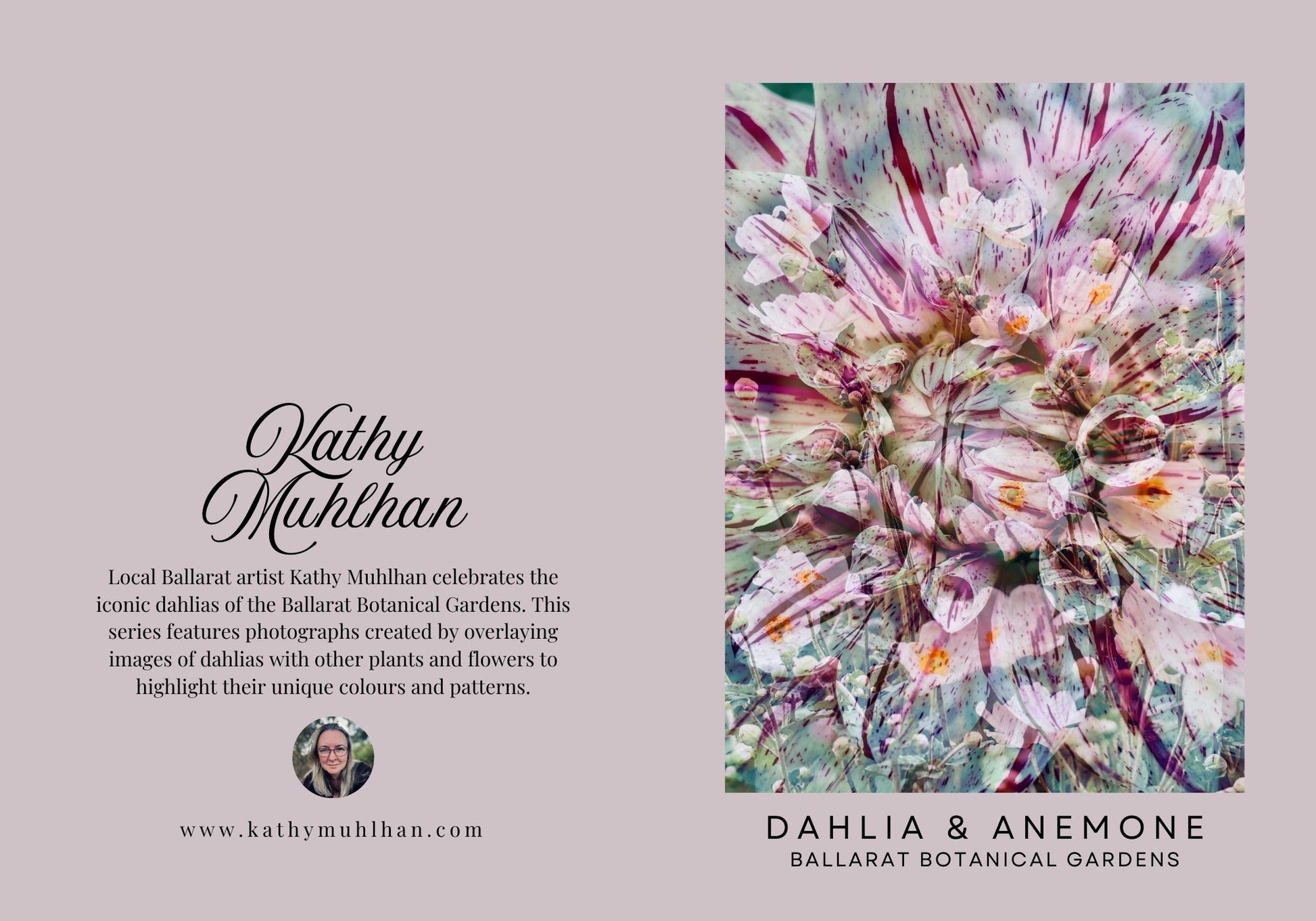 Features photographs by local Ballarat artist Kathy Muhlhan. The photographs in this series celebrate the iconic dahlias of the Ballarat Botanical Gardens, merging images of dahlias with other plants and flowers at the gardens.