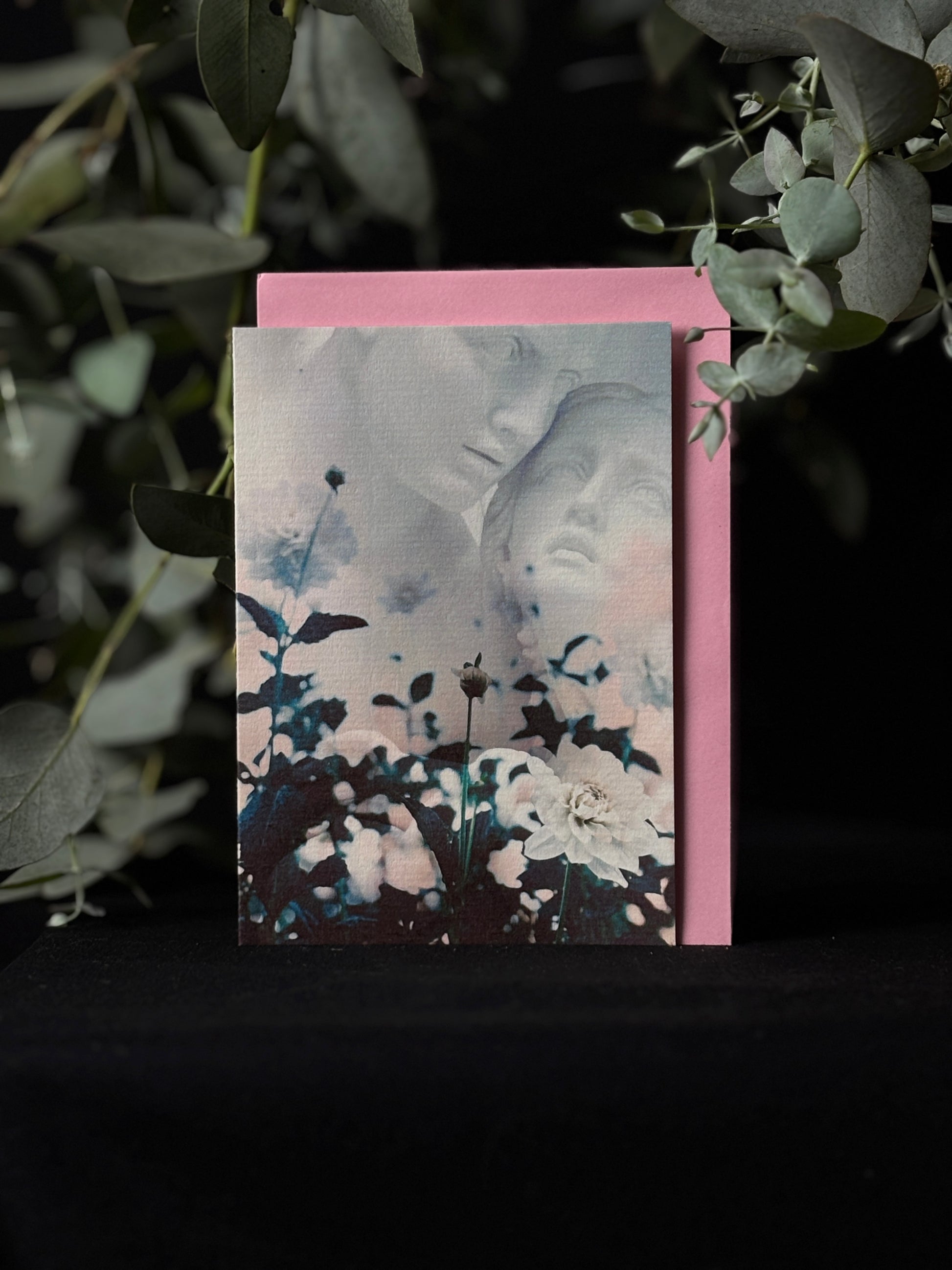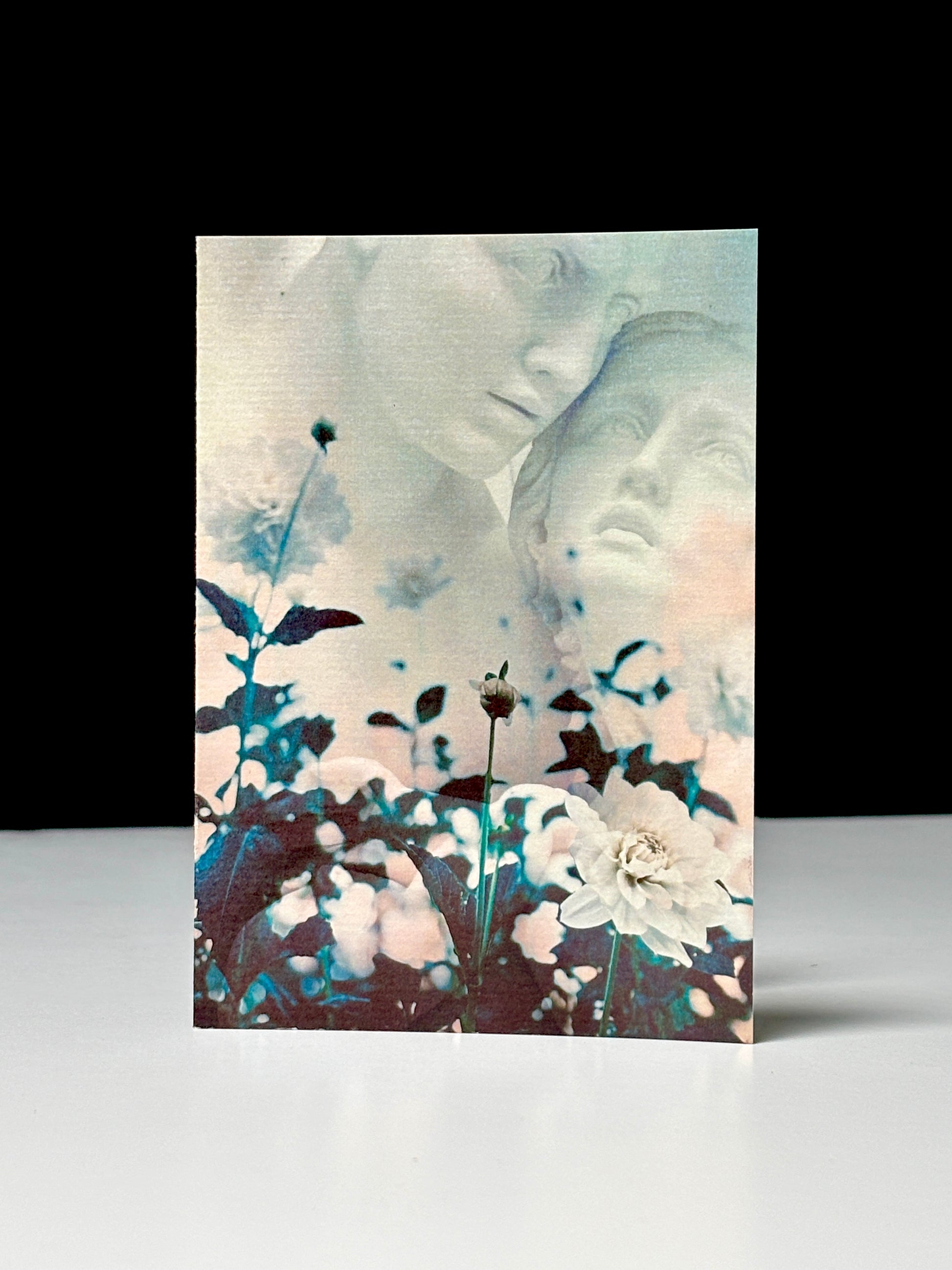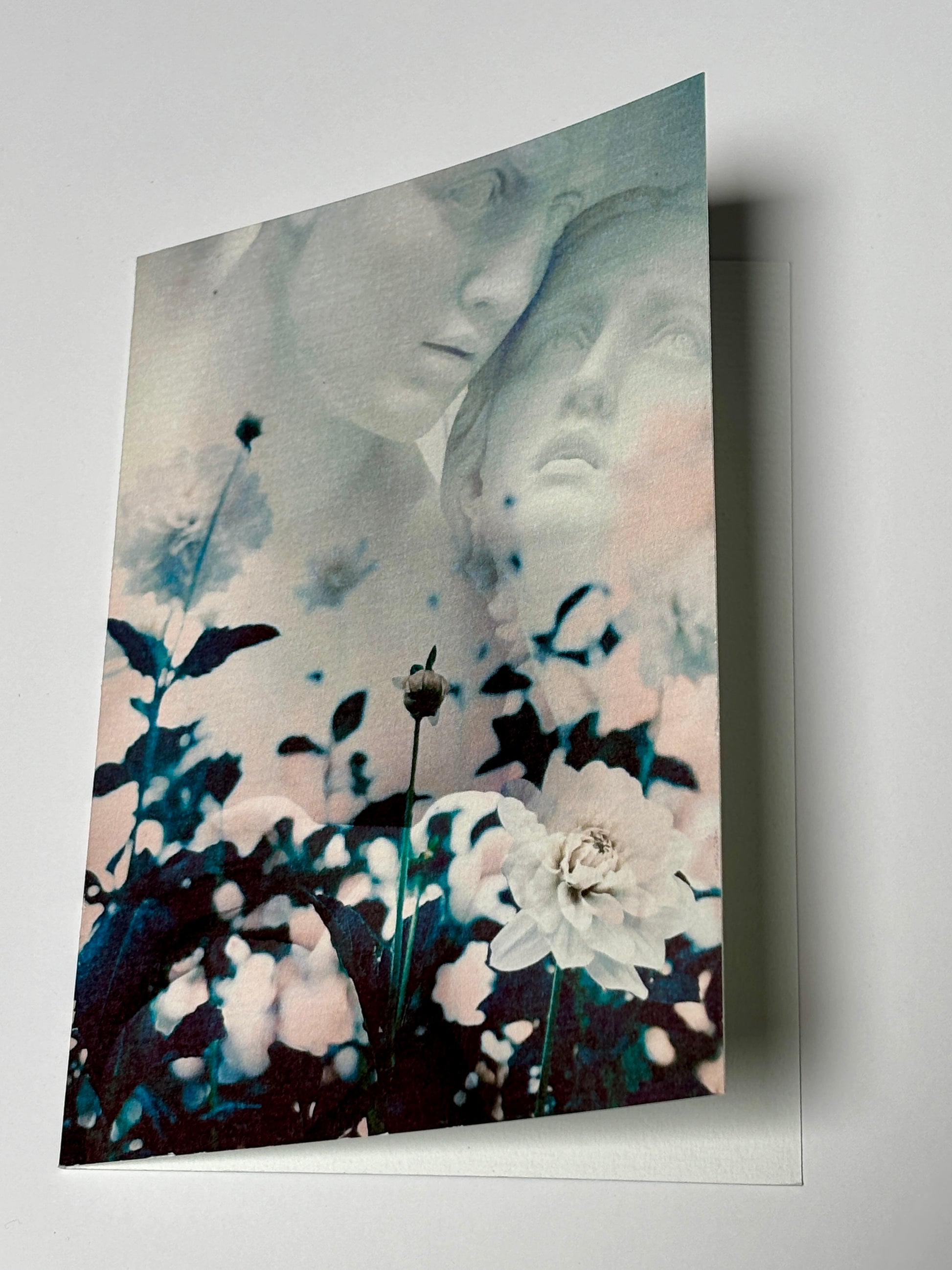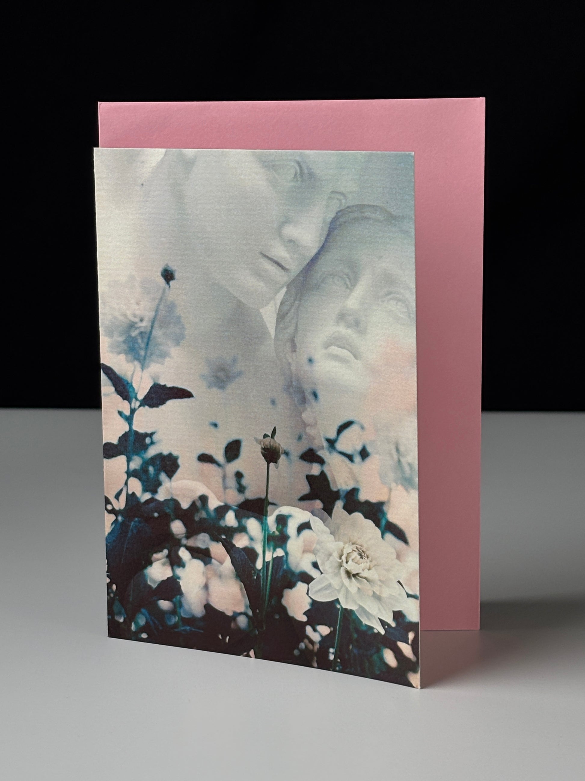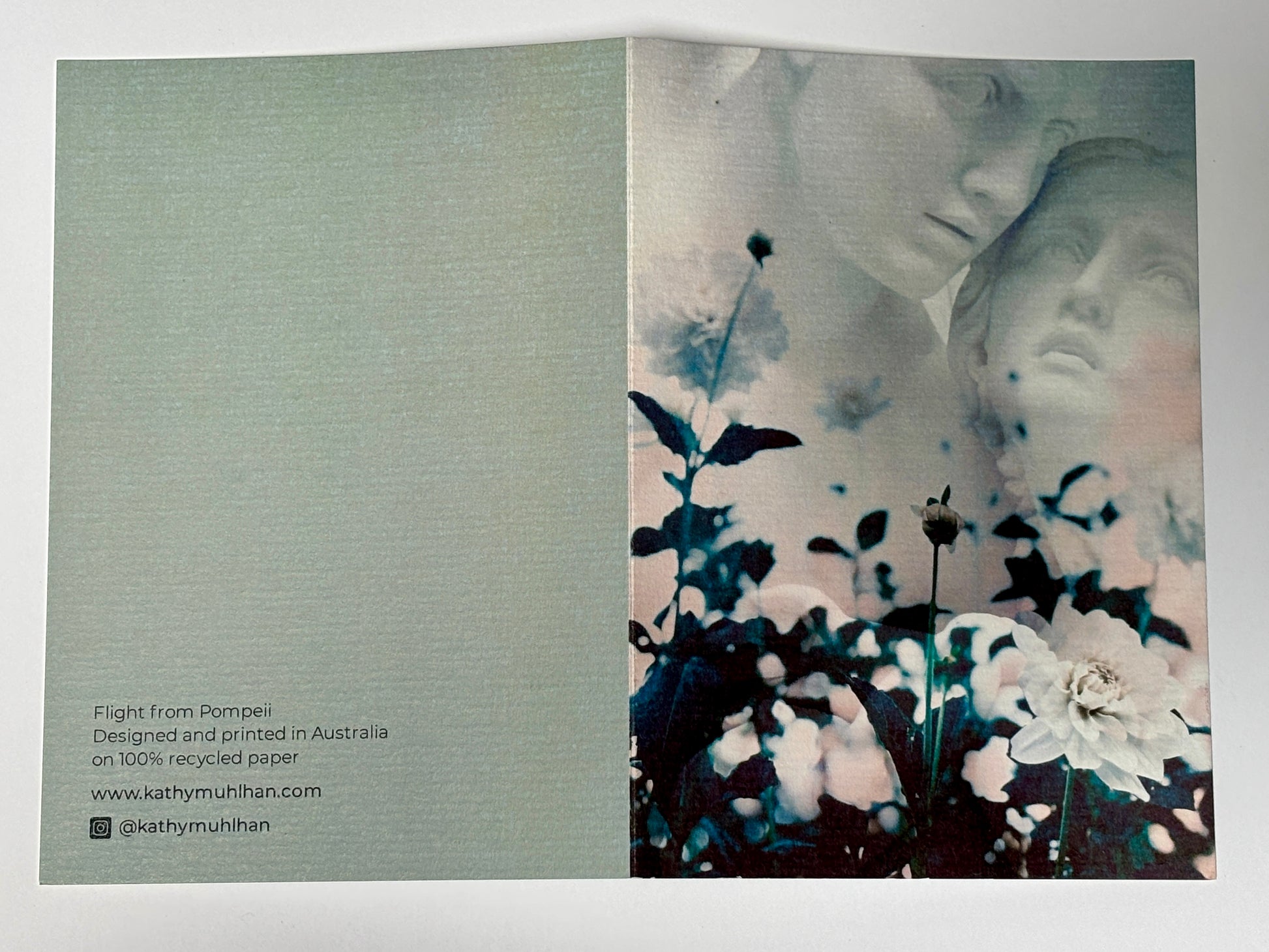 These special greeting cards that double as a souvenir are A6 (10.5x14.6cm) size with a pink envelope. The card is made in Victoria with 300gsm recycled card with a matt textured finish. The photograph captures two figures from the main marble statue, "Flight from Pompeii" located in the Statuary House at the Ballarat Botanical Gardens, with white dahlias overlaid. Cards are blank inside for your own message.