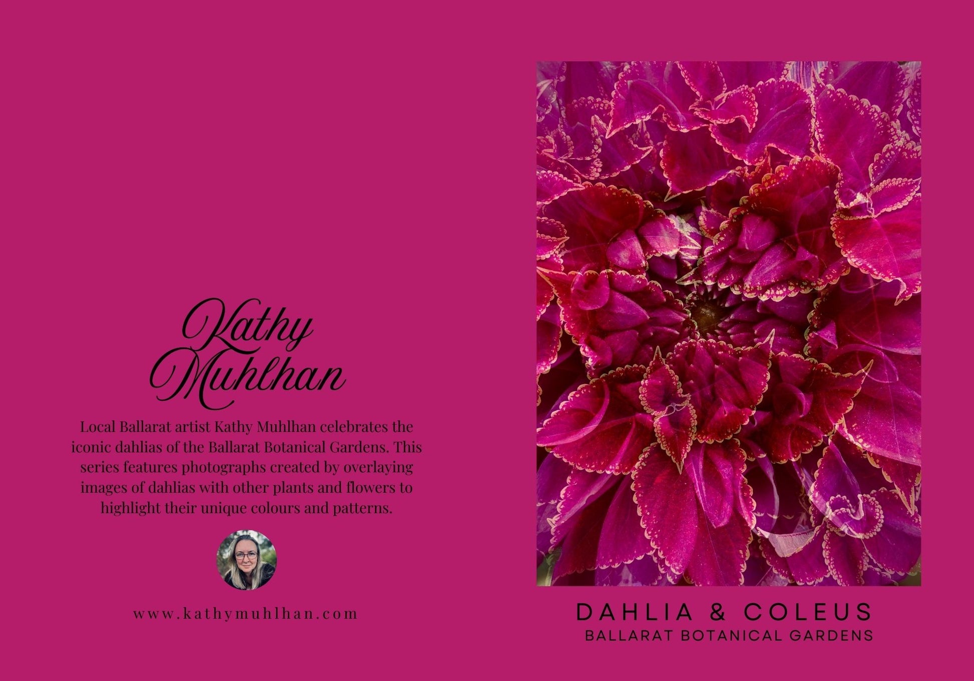 Features photographs by local Ballarat artist Kathy Muhlhan. The photographs in this series celebrate the iconic dahlias of the Ballarat Botanical Gardens, merging images of dahlias with other plants and flowers at the gardens.